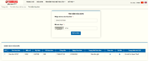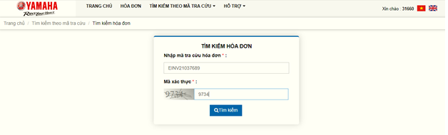 Trả lời: Khách hàng có thể tra cứu hóa đơn điện tử của Yamaha Motor Việt Nam theo 02 cách: