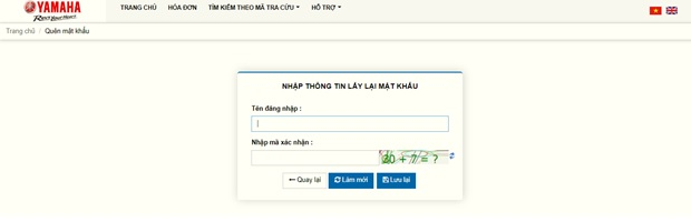 B2: B2: Khách hàng nhập thông tin về tên đăng nhập đã đăng ký với Yamaha Motor Việt Nam và mã xác nhận rồi ấn nút “Reset”.